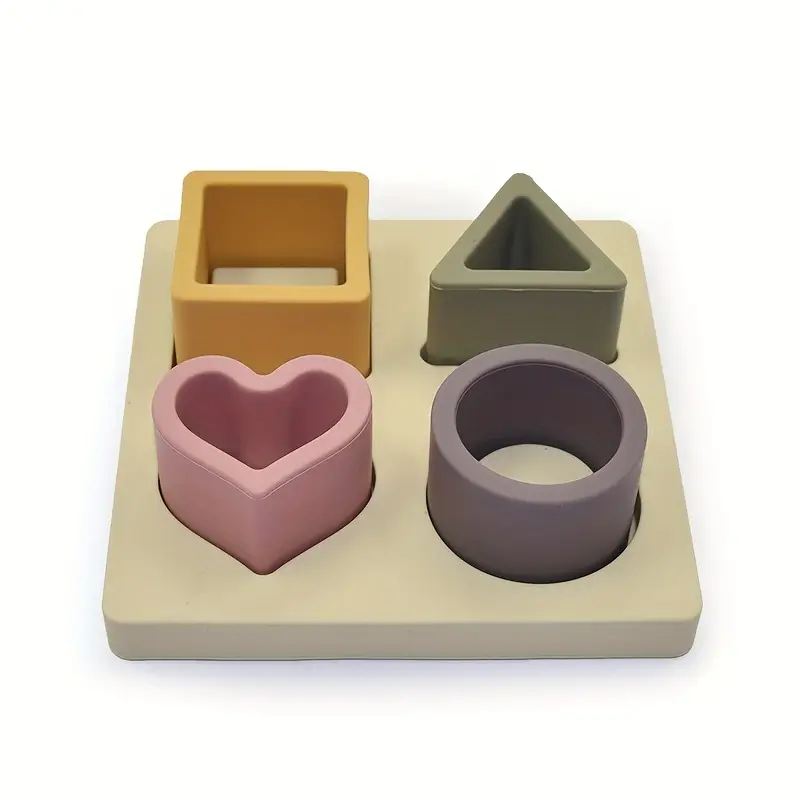 Introduce your toddler to the wonderful world of shapes with this modern, pastel-toned Silicone Shape Sorter Puzzle! Featuring a heart, circle, triangle, and square, this gentle, hands-on toy supports cognitive growth and coordination while keeping things safe and fun.
