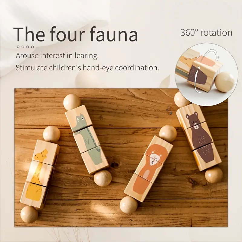 🦁 Animal Matching Fun – Rotate the wooden blocks to align the correct animal images, introducing kids to four different animals.
